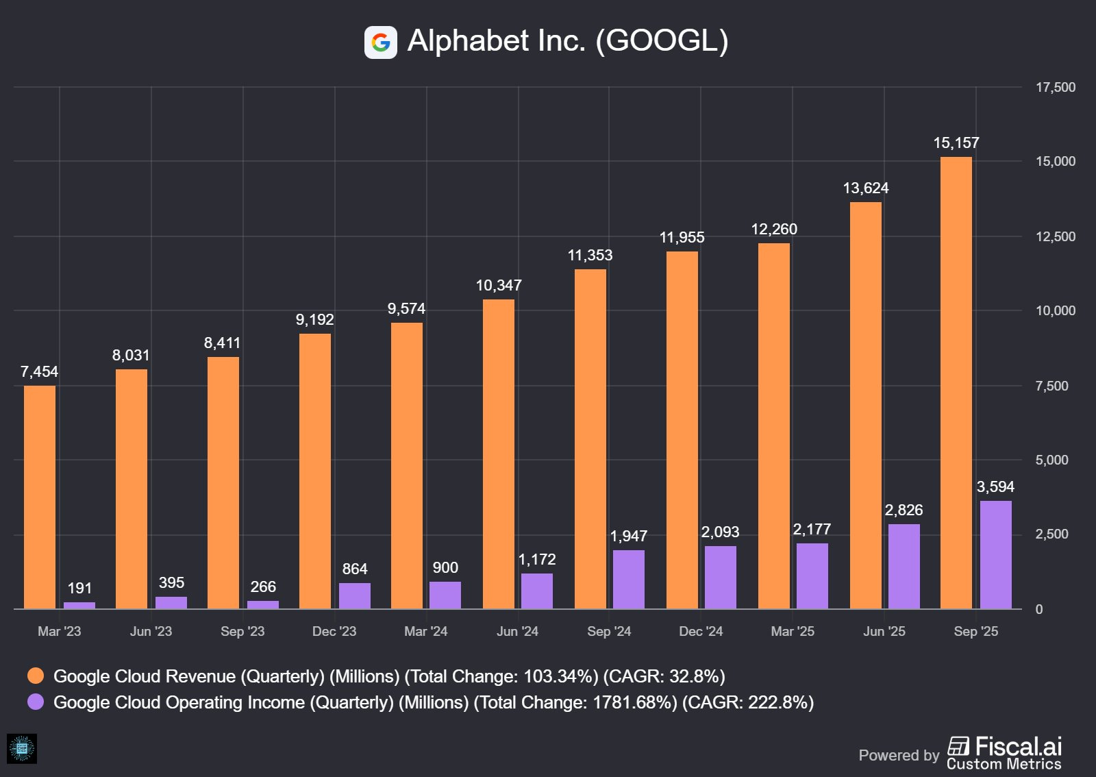 âď¸ Cloud is the growth engine. Google Cloud revenue: $15.2B (+34% YoY); operating income: $3.6B (+85%); operating margin: 23.7%. The Cloud backlog hit $155B and, importantly, management said it was up 46% QoQ and 82% YoYâevidence of enterprise AI demand converting into signed commitments.