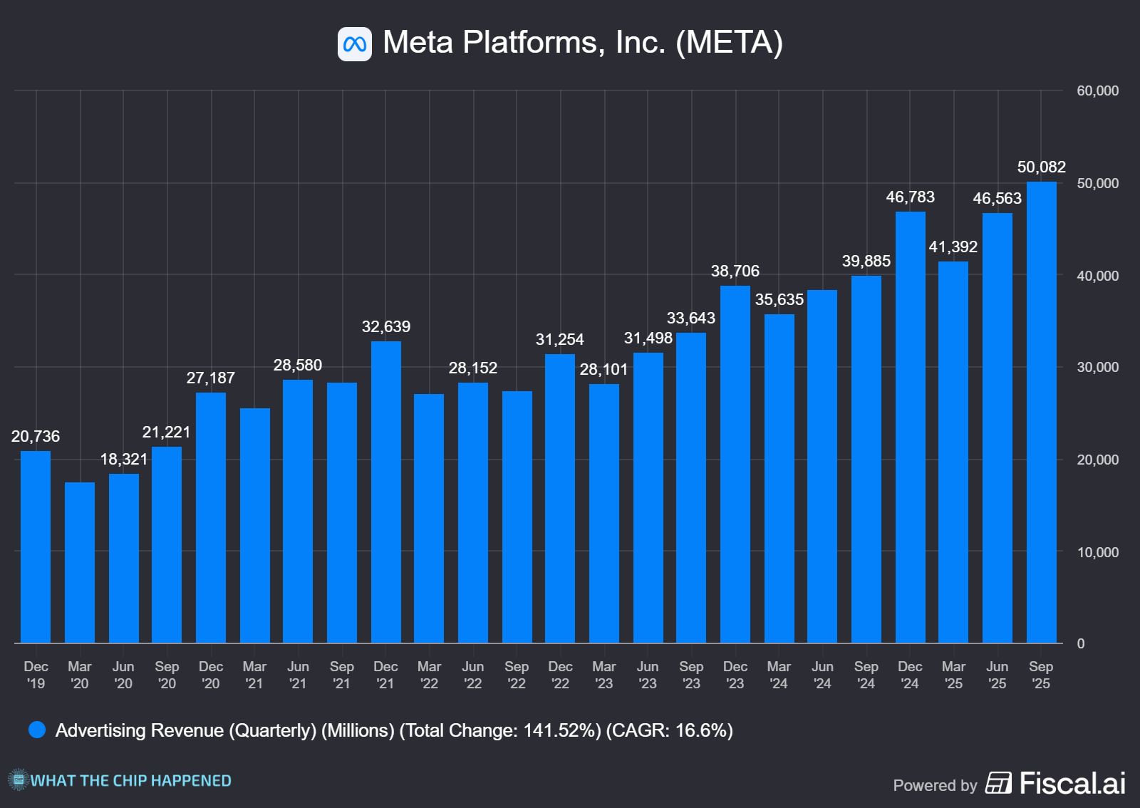 đ Ad engine keeps humming. Ad impressions +14%; average price/ad +10%; FoA ad revenue $50.08B (+26%). The family hit 3.54B daily active people in September. Inside the apps: time spent +5% on Facebook and +10% on Threads; video time on Instagram +30% vs. last year.