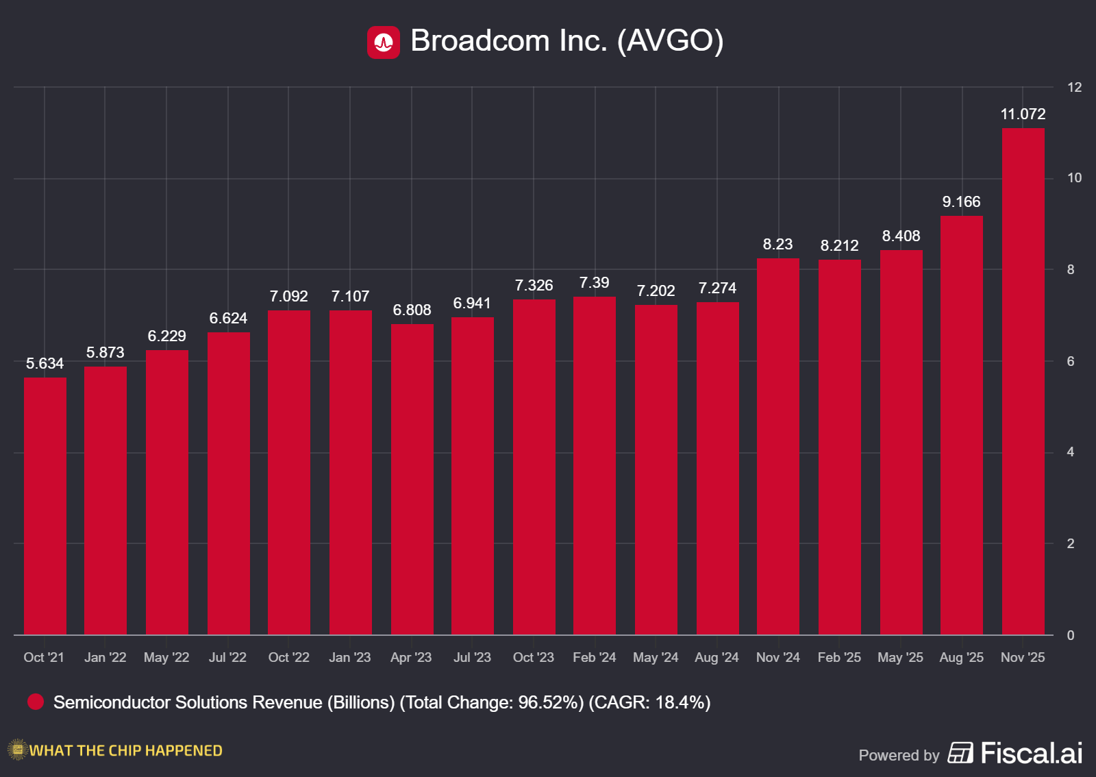 🤖 XPU Customer Expansion: Broadcom now serves five custom AI chip customers. The fourth customer (believed to be Anthropic) placed a $10B order in Q3 followed by another $11B in Q4. A fifth customer added a $1B order—Broadcom is becoming the custom silicon design house for every hyperscaler building alternatives to Nvidia.