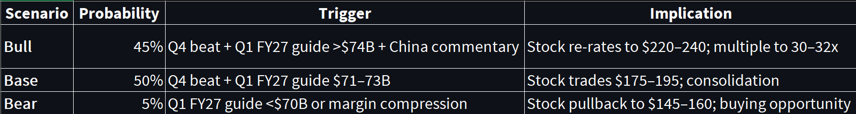 For investors evaluating the setup into Q4 earnings, the asymmetry favors being long. A guidance beat above $74 billion for Q1 FY27 could trigger meaningful re-rating. A guidance miss, which would require demand to have softened despite every hyperscaler announcing increased CapEx, is unlikely given the timing of those announcements. China represents a free call option with substantial upside.
