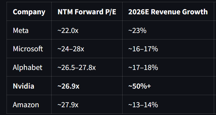 At approximately 26x forward earnings with 50%+ revenue growth expected in FY2027, Nvidia trades in-line with the Magnificent 7 average despite dramatically superior growth. The market is pricing in excessive risk that the data does not support.
