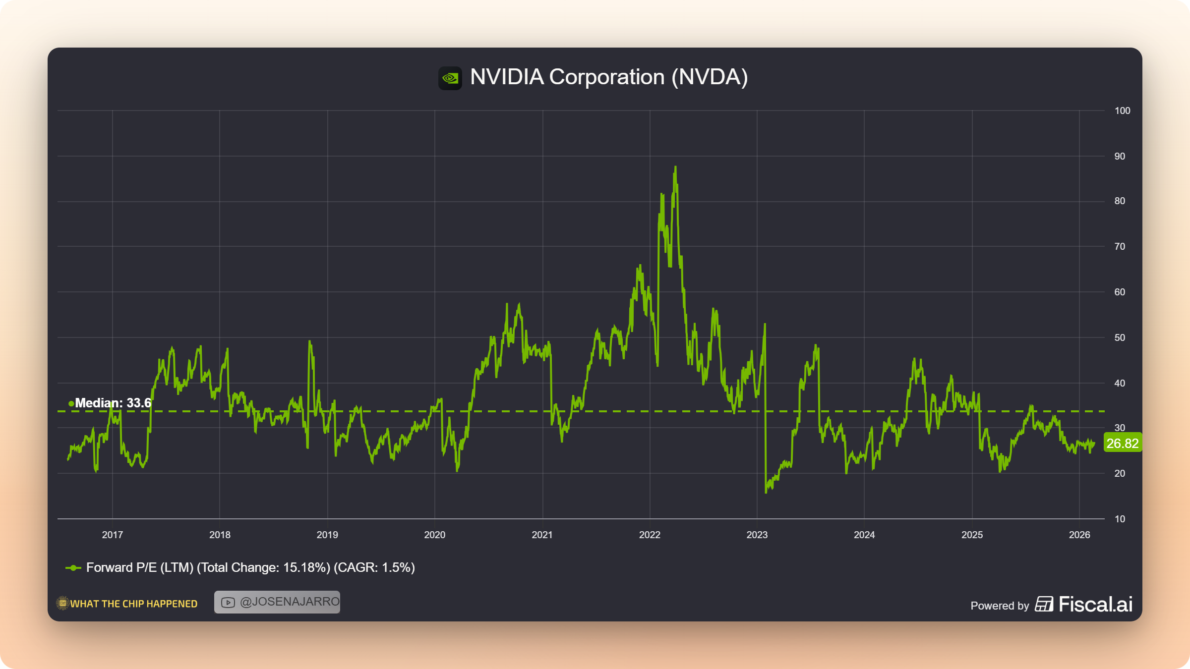 Nvidia is the most mispriced mega-cap in technology. At ~26x forward earnings with 50%+ growth, implying the market assigns a massive risk premium that the evidence does not support.