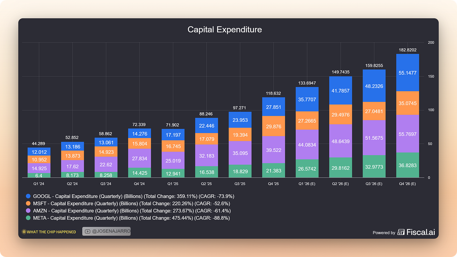 Alphabet guided to $175–185 billion in 2026 CapEx—nearly double 2025 levels.