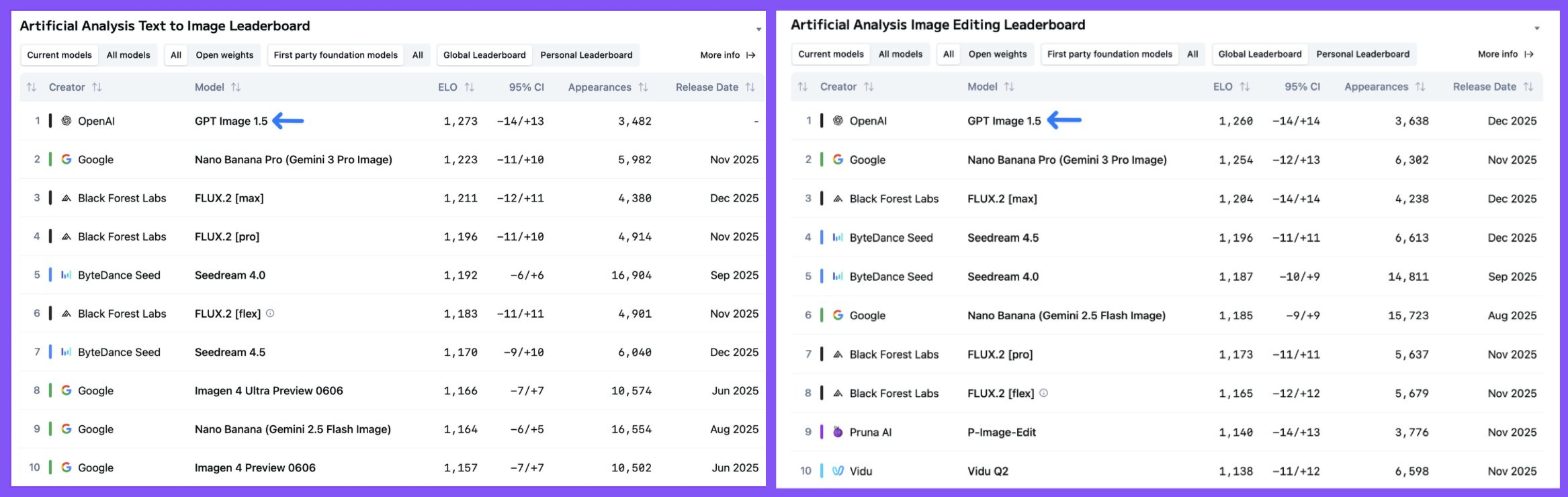 🏆 Benchmark Dominance: GPT Image 1.5 ranks #1 in BOTH Text-to-Image AND Image Editing categories on Artificial Analysis Image Arena, surpassing Nano Banana Pro and other leading models. OpenAI isn’t just competitive, they’re setting the benchmark.